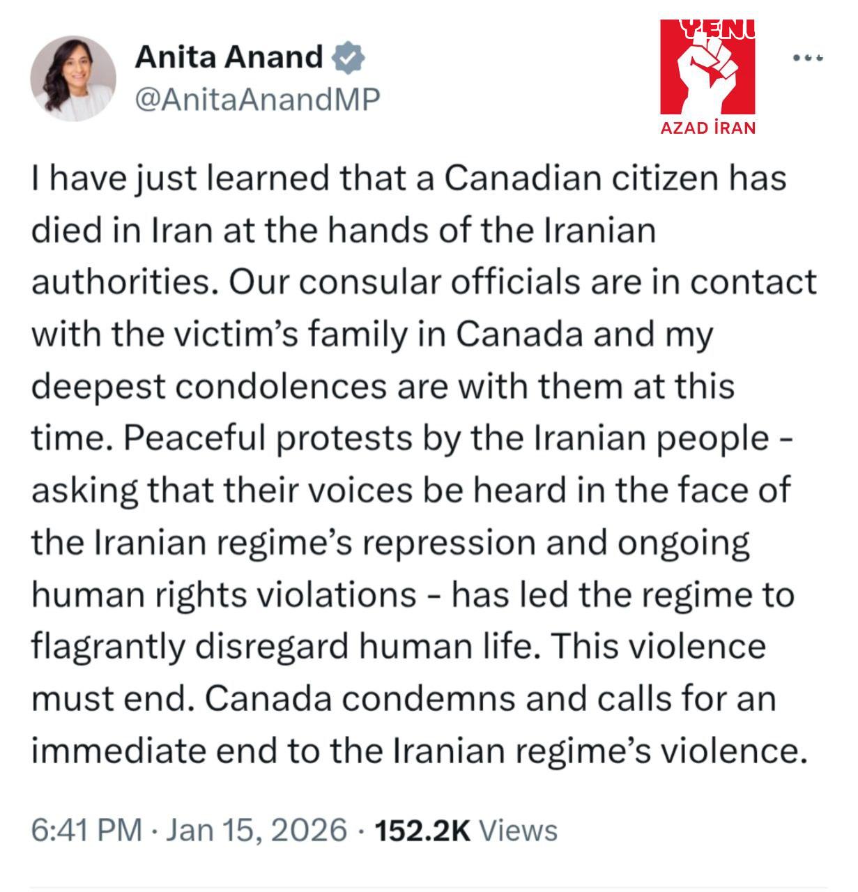 Anandın “X” hesabında paylaşdığı açıqlamada deyilir ki, “İran xalqının dinc etirazları və insan haqları pozuntularına qarşı səslərinin eşidilməsi tələbləri, rejimin insan həyatına laqeyd yanaşmasının nəticəsi olub.”Qeyd edək ki,bu barədə məlumat Azad İran Telegram kanalında da paylaşılıb.