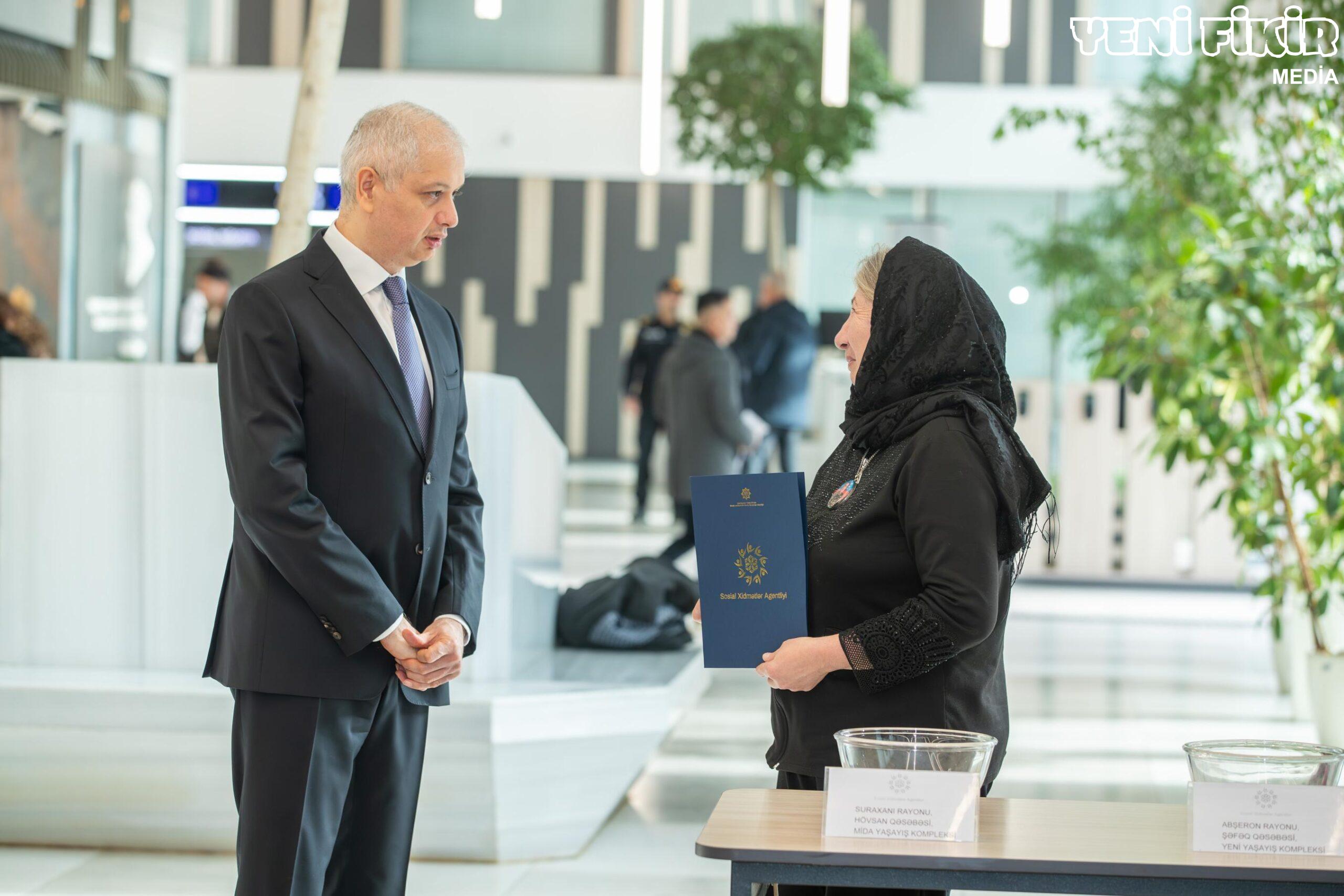 Əmək və Əhalinin Sosial Müdafiəsi Nazirliyi tərəfindən şəhid ailələrinə və müharibə ilə əlaqədar əlilliyi olan şəxslərə daha 115 mənzil verilib.Mənzillər Bakı və Naftalan şəhərlərində, eləcə də Abşeron, Sabirabad, Oğuz, Qax, Lənkəran, Astara, Zərdab, Ağcabədi, Göyçay, Ağdaş, Qazax, Yevlax və Kürdəmir rayonlarında yerləşən yeni yaşayış binalarından təqdim edilib.Bakıda 4 saylı DOST Mərkəzində keçirilən sənədlərin təqdimatı mərasimində əmək və əhalinin sosial müdafiəsi nazirinin müavini Hidayət Abdullayev həssas əhali qruplarına yönəlmiş sosial müdafiə tədbirləri barədə məlumat verib. Qeyd olunub ki, Prezident İlham Əliyevin xüsusi qayğısı nəticəsində şəhid ailələri və müharibə əlillərinin sosial müdafiəsi davamlı şəkildə gücləndirilir.